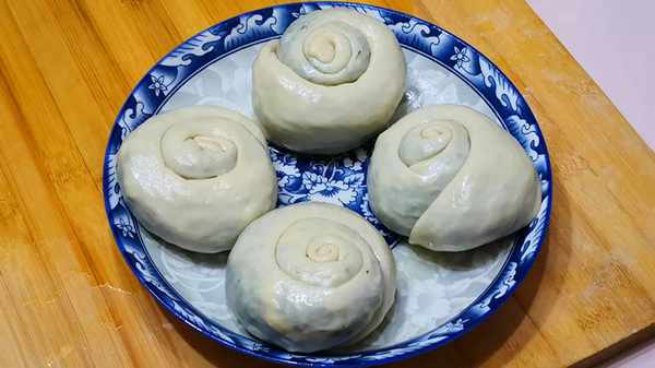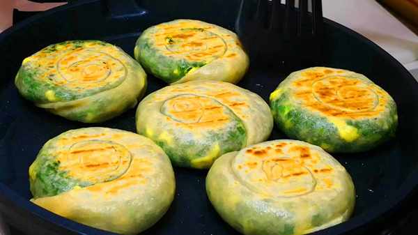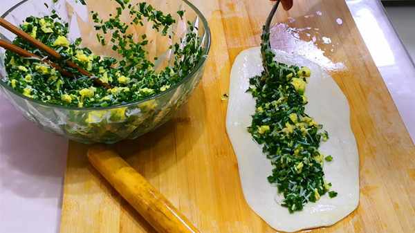取一個面團按扁搟薄,然後中間放上調好的韭菜餡料,接著對折餅皮,將餡料包起來後,再從端慢慢卷起,邊卷邊抻,因為面醒發瞭兩次,又加瞭油和鹽,所以會很有韌性,不用擔心會抻破瞭,抻得越薄越好吃,卷好後再將尾部壓在餅的反面壓平,輕輕將餅按扁,這樣餅胚就做好瞭。