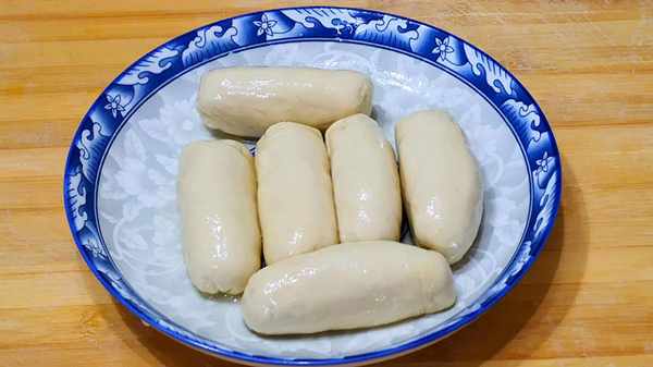2.面團大約醒10分鐘後,我們把它取出,放到撒有面粉的案板上,揉搓片刻後將其搓成長條,再分成均等大小的面劑子,然後再把每塊面劑子揉一揉,揉成長條後放到盤裡,用油刷將每一塊長條表面都刷滿植物油,然後蓋好保鮮膜繼續醒面。