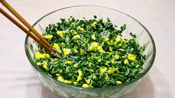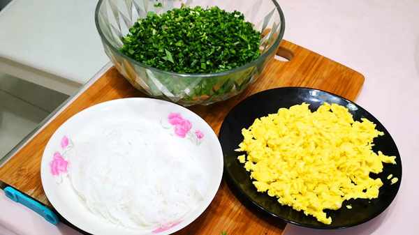 雞蛋2~3個打入碗中充分打散,起鍋加多一點的油,然後倒入蛋液,用筷子不停地攪拌,將雞蛋煎成細小的雞蛋碎後盛出,晾至不燙時再倒入韭菜中,然後把切碎的粉絲也倒入。因為炒雞蛋時放的油足夠多瞭,所以就不需要再加油瞭,攪拌均勻後,再加入胡椒粉和鹽,繼續攪勻就可以瞭。調韭菜餡時,放的料越簡單越好吃,切忌亂七八糟什麼調料都往裡加。