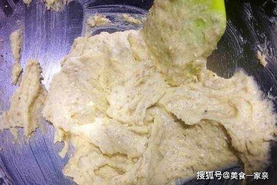 7.篩入混瞭核桃粉的豬油混合物中,用刮刀切拌混合。