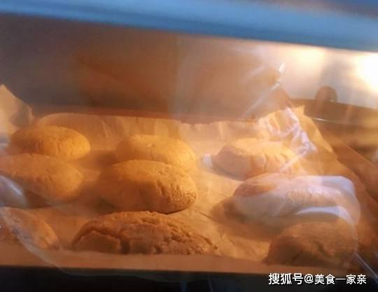 不用壓得太扁也無需擔心中間的小坑,烘烤的過程中核桃酥會膨脹變扁的。這是烤瞭十分鐘左右的狀態,自然形成好看的裂紋。