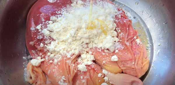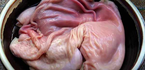 2、豬肚我一般會加鹽、面粉和油,給它抓洗,這一面用同樣的方法洗兩遍,就很幹凈瞭,先用清水洗凈胃管上的白色黏膜,再用開水燙一下,然後用刀刮一下就可以瞭。