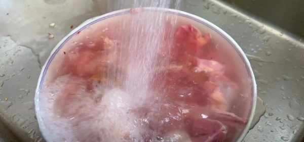 3、把血水沖幹凈,燉出來基本上沒有什麼浮沫,就這樣用水沖,沖個十分鐘,血水基本上沒瞭,到時候再抓一抓,拌一拌,血水全部出來瞭。