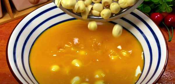 6、然後再把雞蛋液給它過篩一遍,那樣子會更加細膩,這邊提前泡瞭點蓮子,也加入雞蛋液中。