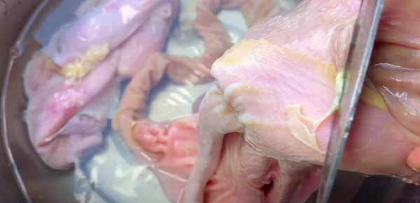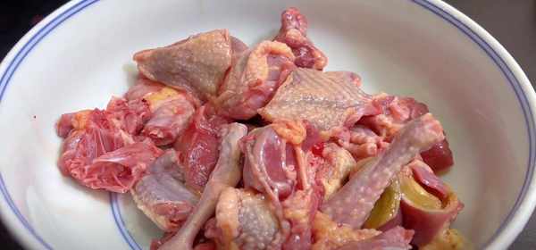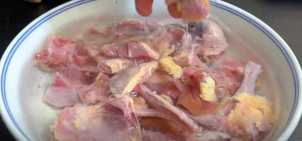 2、處理幹凈以後,把它砍成塊,還要記住把淋巴也要切掉,這個是不能吃的,砍好的鴿子放入盆中,千萬不要直接焯水,隻用把血水沖幹凈就可以燉瞭。