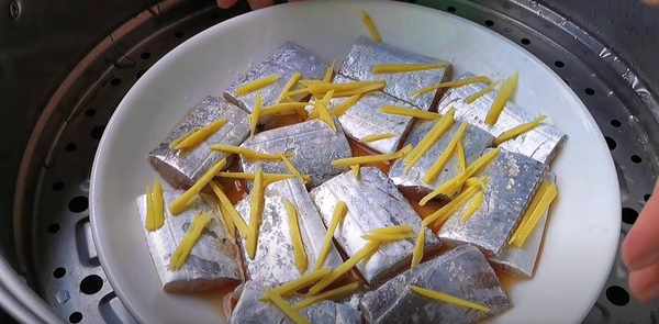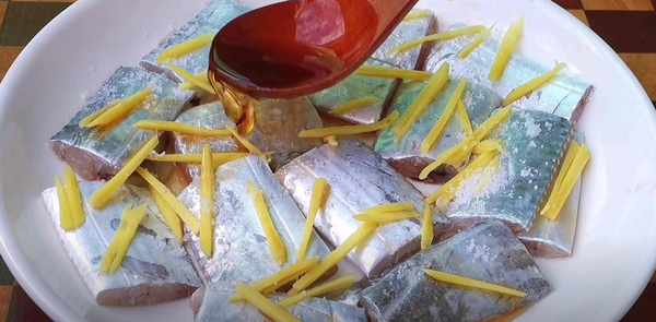 4、再切一些薑絲,把薑絲均勻地鋪在帶魚的上面,再撒上少許鹽,給帶魚增加一個底味,然後淋入一勺黃酒去腥。