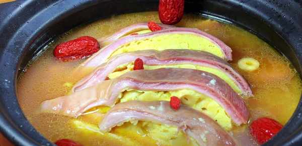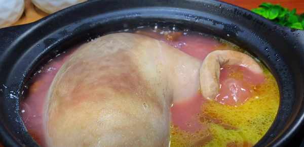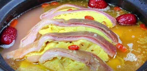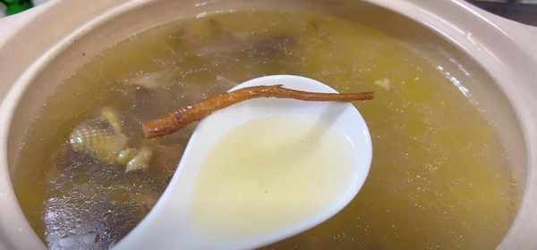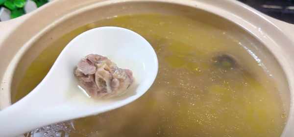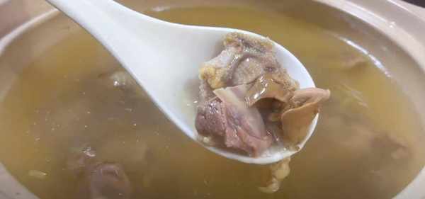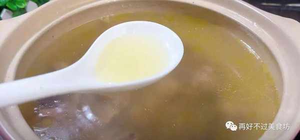 7、時間到瞭,這個湯就像保溫的一樣,熱湯青黃澄澄的,肉一掐就爛,喝起來有一種很好喝的味道,也就是這個養生的藥材起的作用,加上肉燉出來的湯,有很不錯的味道,喝瞭還想喝的感覺。