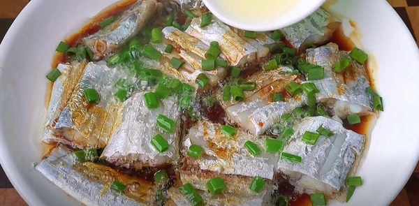 8、起鍋燒油,把油燒沸騰,趁熱把油澆在帶魚的上面,激發出它們的香味,這樣一道清蒸帶魚就做好瞭,既簡單又美味,營養不流失,肉質細嫩,入口即化,真的太好吃瞭。