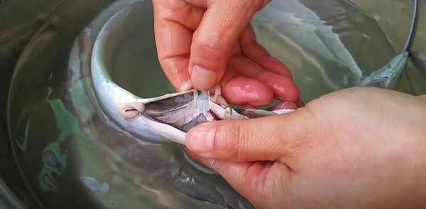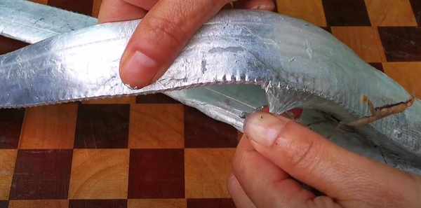 2、然後把它清洗一下,把內臟去除掉,再把黑膜撕掉,洗幹凈後把頭切下扔掉,然後再把帶魚切小段備用。