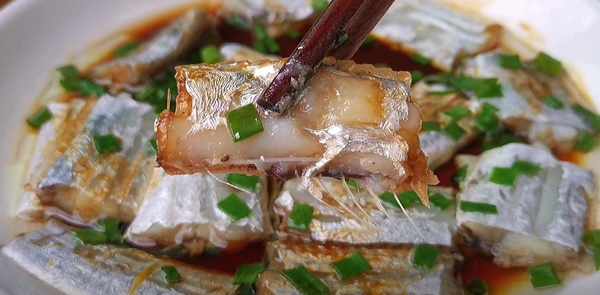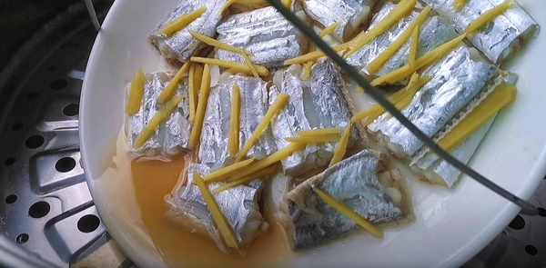 5、再放入蒸鍋裡,蓋上蓋子,水開後,蒸上五分鐘時間,帶魚就蒸好瞭。