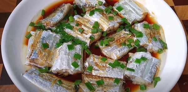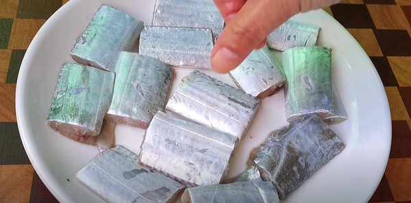 3、帶魚營養非常的豐富,含有大量的蛋白質及維生素A,能夠補充身體營養各種成分,全部切好後,把它整齊地擺好在盤子裡。