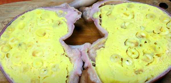 7、將所有食材和雞蛋液混合後,然後倒入豬肚中間,然後用針線把豬肚給縫合起來,像比較大的開口也要用針縫起來,那樣子雞蛋液就不會漏。