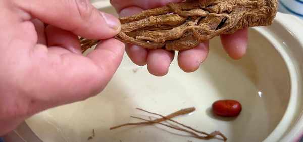 5、下來準備湯料,一是紅棗少不瞭,二是人參須拔兩根,天冷瞭,要養生就用它來養生,知道的人都知道它的好處,隻需在它表面拔兩根胡須就行瞭,好吃得很,湯味濃正,而且對身體好。