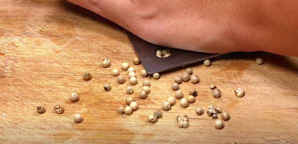 8、再來準備一點白胡椒粒,把它壓碎一點,然後就放一旁留著備用。