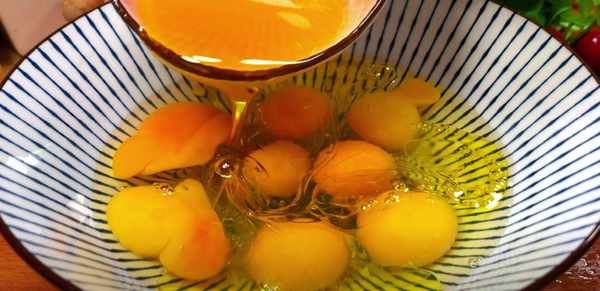 5、另外再準備一個小碗,往裡倒入一小碗的山茶油,然後把它加入雞蛋裡面,調味的話,加適量的鹽和胡椒粉,再用筷子攪拌均勻。
