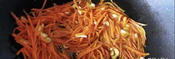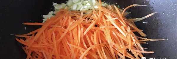 5.開大火,鍋裡放油,把大蒜切片放進去爆香,然後把胡蘿卜絲放進去翻炒一會兒。
