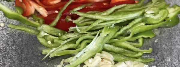 3.紅椒,青椒去籽後,切成細一點的絲做配菜,拍點蒜末。