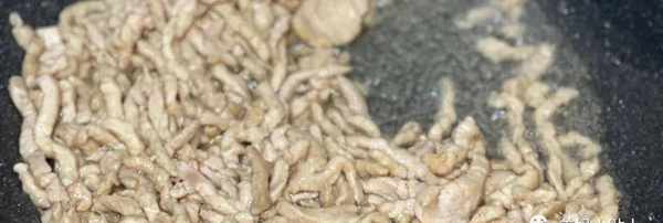 5.鍋裡放多一點油,大火燒熱,把肉絲放進去利用大火滑至變色,條條分明先撈出來備用。