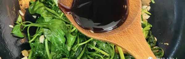 3.然後把紅薯葉放進去翻炒到癟瞭,軟瞭,再放入一勺蠔油,圖片的太多瞭,可以放少一點,然後再加入一點鹽。