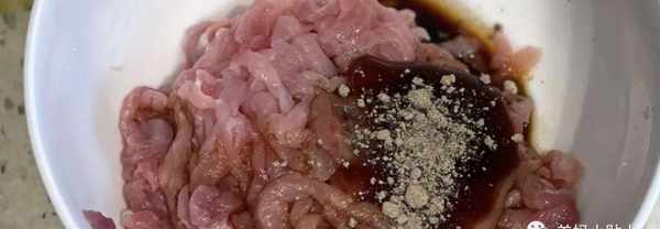 4.瘦肉選美一點的,切成細細的肉絲,加入蠔油,生抽,胡椒粉,一勺淀粉,攪拌或者抓拌均勻。