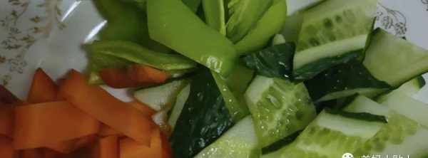 3.胡蘿卜削皮切一點,尖椒去芯切塊,青瓜也切一點。