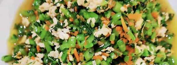 6.鍋裡放油,把蒜末放進去爆香,先把雞身材肉炒成顆粒分明的狀態,再加入胡蘿卜碎翻炒熟,加入鹽,雞精翻炒入味,最後加入茼蒿碎一起翻炒熟就可以出鍋瞭。