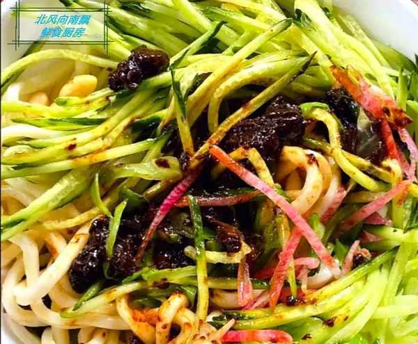 2 放入黃瓜絲,水蘿卜絲,香菜,炸的肉醬或者雞蛋醬,拌勻即可,清爽可口傢常美味面條。