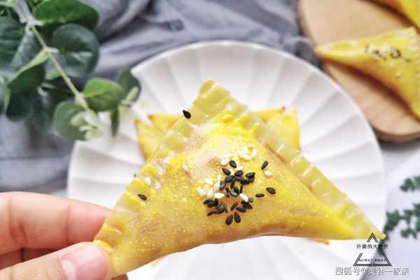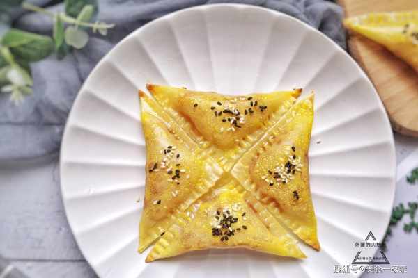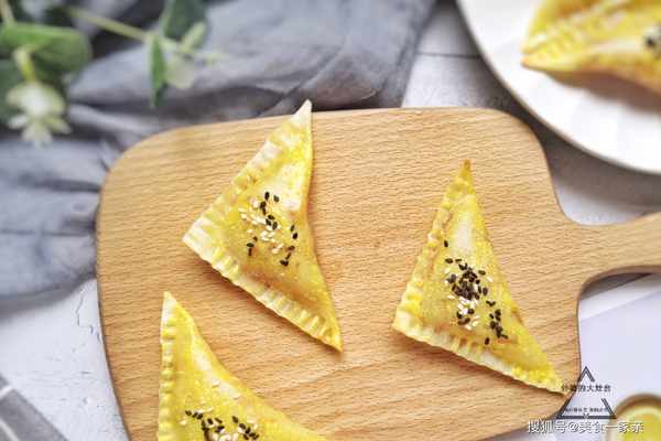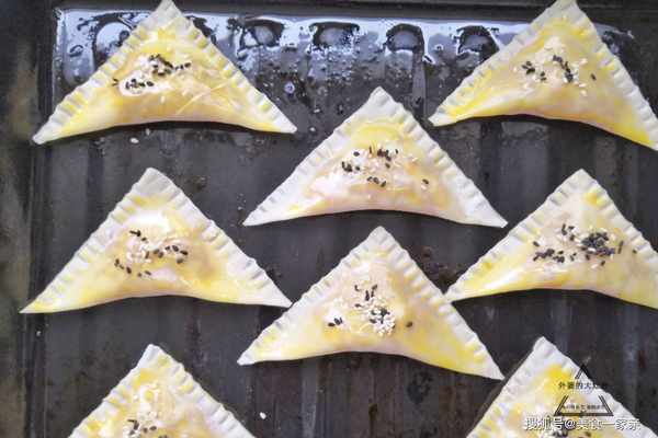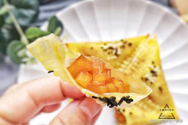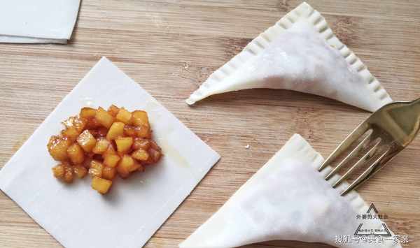 4、取一張餛飩皮,在上半部分放入充分晾涼的焦糖蘋果,接著在兩邊塗少許蛋液,然後沿對角線折疊,再用叉子按壓封口即可,這樣焦糖蘋果早餐包的初型就做好瞭。焦糖蘋果不宜放太多,不好封口。