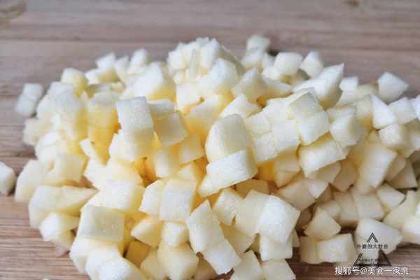 1、蘋果用清水洗凈,削去外皮,切成四瓣,接著去掉蘋果核,切成蘋果丁,備用。蘋果丁的大小約為1cm見方,不宜太小,炒後會縮水。