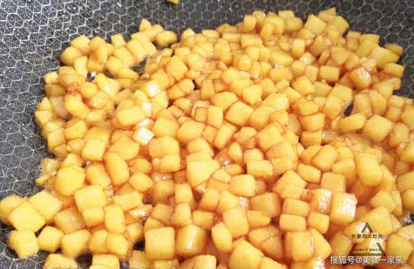 2、炒鍋中加少許清水,煮沸後放入冰糖,攪拌至融化,接著小火慢慢熬煮,至水分熬幹,冰糖呈黏稠的糖漿,繼續不停攪拌,待糖漿變成焦糖色,且有均勻的小氣泡出現時,放入蘋果丁,翻炒均勻,使蘋果丁都均勻的裹滿焦糖,繼續翻炒至蘋果中的水分收幹,即可盛出,晾涼備用。