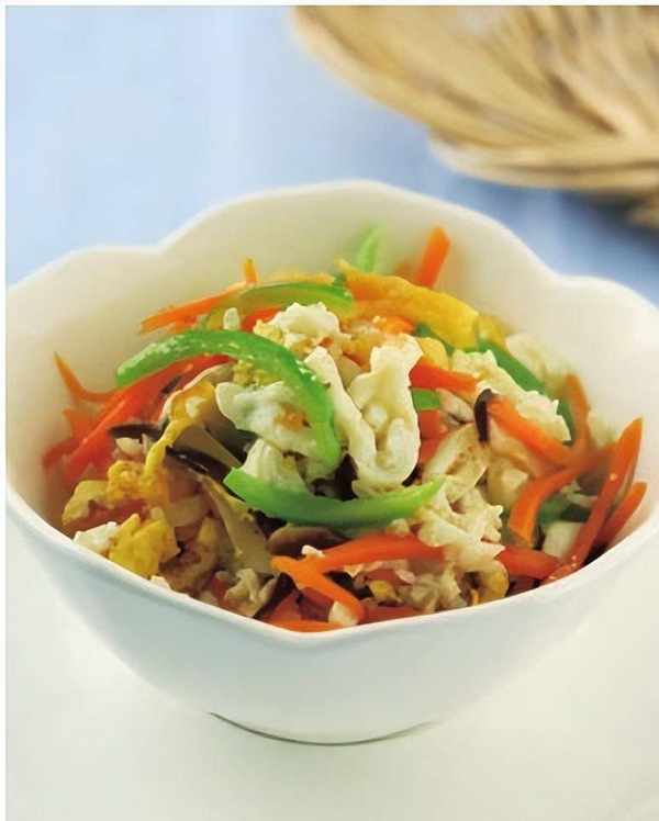3.炒鍋置火上,放植物油燒熱,放入胡蘿卜絲、香菇絲、青椒絲,煸炒至熟。
