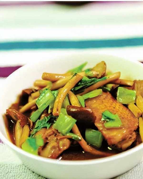 原料:雞翅 400 克,茶樹菇 20 克,黃芪 10 克,油菜心 3 棵。