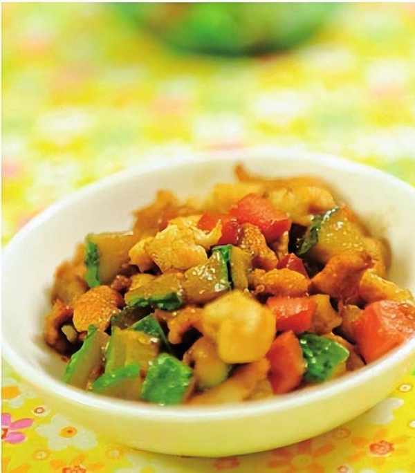 做法:1.雞胸肉洗凈切小丁,加入白糖、料酒、淀粉,醃拌片刻;黃瓜和胡蘿卜洗凈切丁;胡蘿卜丁用沸水汆燙,過涼水備用。