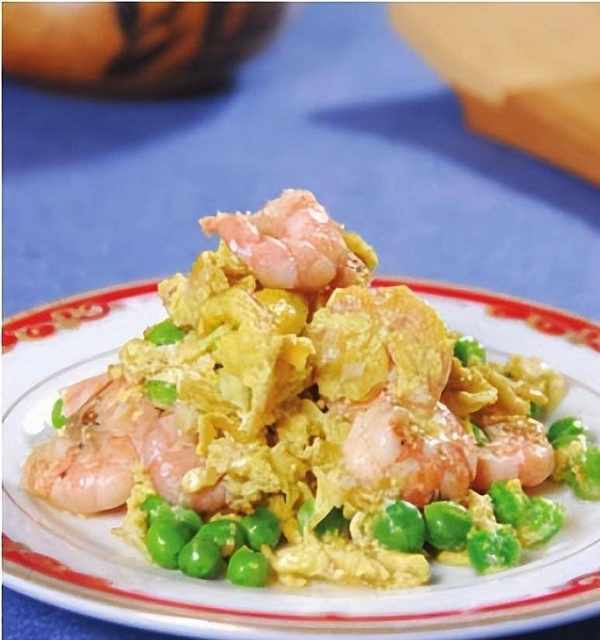 原料:蝦仁 200 克,鮮豌豆 50 克,雞蛋 2 個,蔥 1 根。