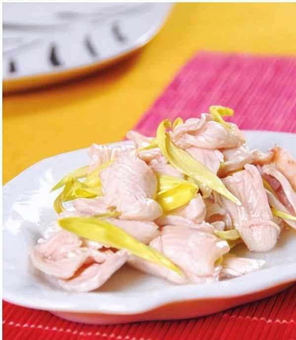 做法:1.雞肉切片,菊花瓣用冷水輕輕洗凈,蔥切成小段,雞蛋去黃留清。