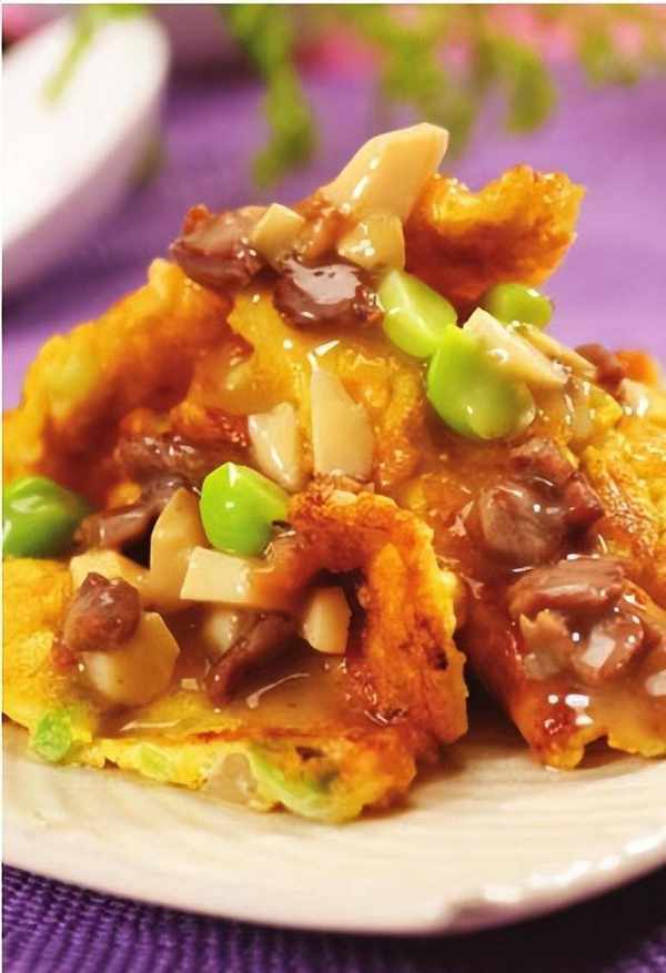 2.另起油鍋加熱,下入白糖炒至呈紅褐色時,放入醋、薑末、蒜末,添加清湯,燒沸,下入水淀粉勾芡,澆在雞蛋上即成。