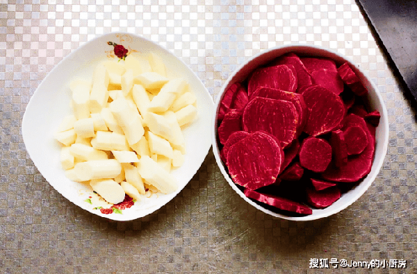 準備適量山藥和紫薯,分別清洗幹凈,去掉表面的泥沙,然後刮掉外皮,沖洗一下,切成小塊,放進蒸鍋內。