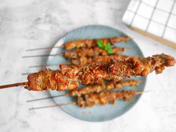 2 羊肉切小塊,準備好清水浸泡過的竹簽。