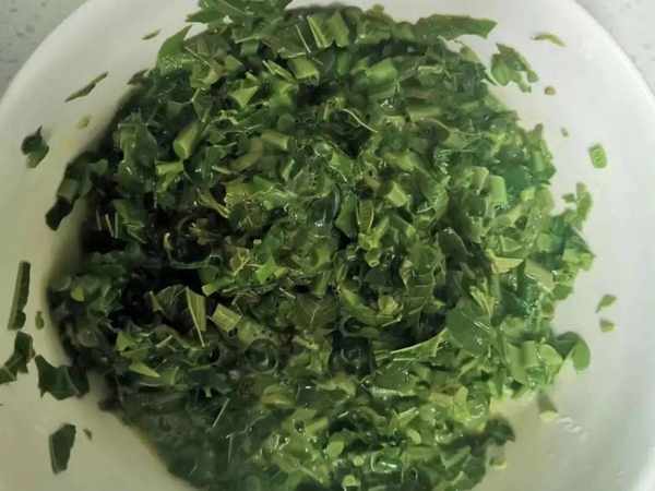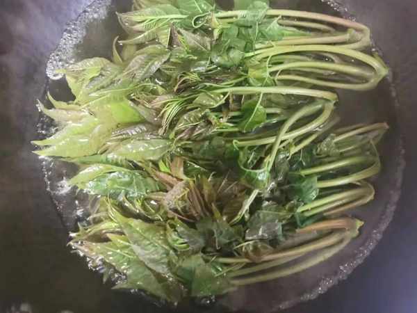 2、香椿沖洗幹凈後放入開水裡,一分鐘後拿出用水沖涼(香椿中含有硝酸鹽和亞硝酸鹽,焯水可以有效去除);