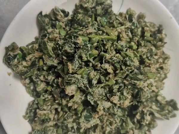 4、在香椿末裡放一小勺生粉拌一下(在香椿裡加一點生粉,可以去除裡面多餘的水分,也可以增加蛋液的粘稠,這樣炒出來的香椿炒蛋不會讓蛋和香椿分散);