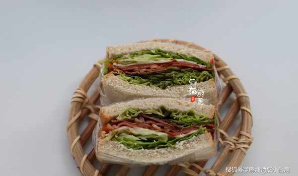 這是一道基礎三明治,材料有培根2片,生菜適量。生菜洗幹凈,平鋪在全麥吐司面包上,然後把培根稍微煎一下,同樣放入生菜上,可以加一點番茄醬,增加一些酸甜的口感。然後再蓋上一層全麥面包,用保鮮膜裹緊,吃的時候可以像我一樣,把它對半切開,特別有滿足感!
