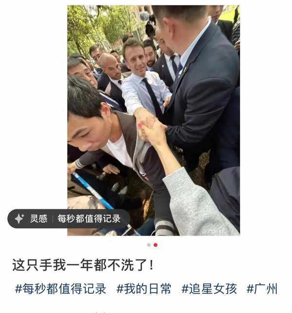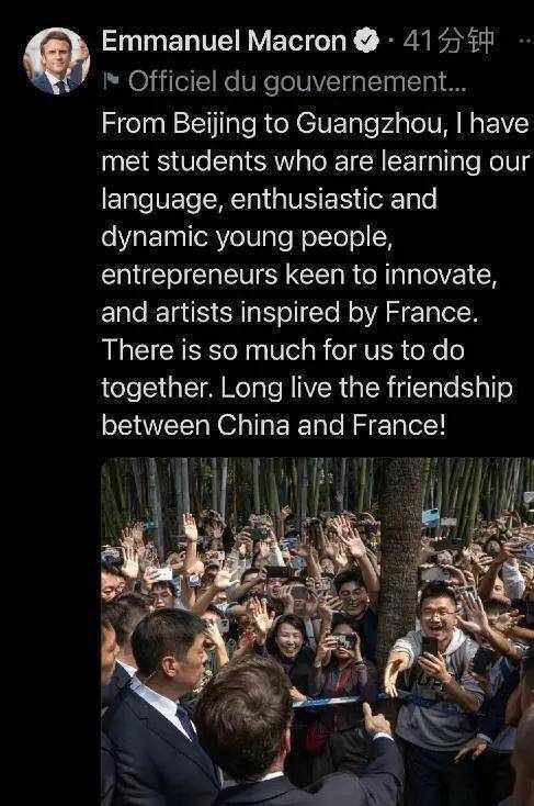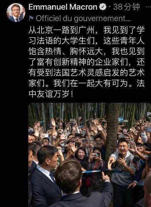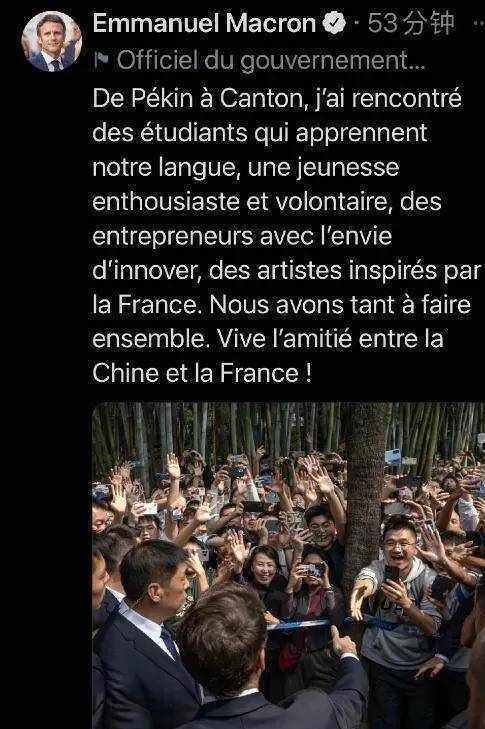 馬克龍先生在享受完瞭廣州美食和北京烤鴨之後,發出瞭3種語言的帖子,字裡行間難以掩飾心中的喜悅,在廣州多受學生的熱情擁堵,在這趟吃喝玩樂之旅就有多開心吧。