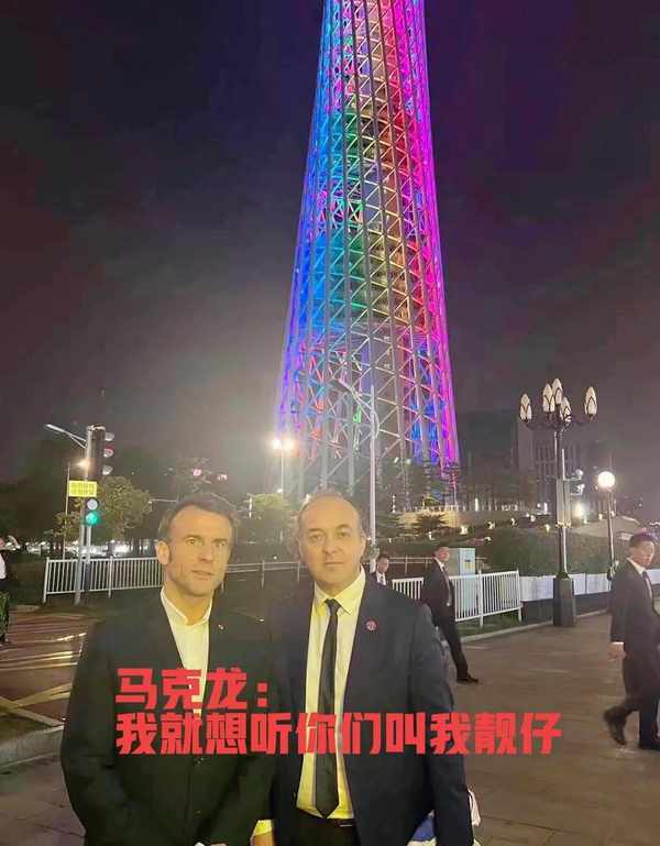 再來看看馬克龍先生珠江夜遊前在廣州塔下的合照,像不像你多年沒回中國的遠方大表哥?廣州中山大學的學生在一周前就知道有大人物要來,學校進行著大規模的翻修,甚至把打一批蹲坑換成瞭馬桶。