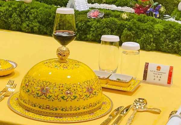 對於這次馬克龍來華的國宴沒有對外透露,但是從流露出來的國宴餐具可以看出,是空前地高規格,還貼心地準備瞭馬克龍愛喝的紅酒。