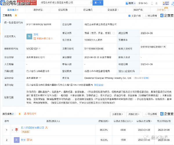 4月10日消息,企查查APP顯示,日前,峨眉山高橋威士忌酒業有限公司成立,法定代表人為劉楊,註冊資本1億元人民幣,經營范圍包含: 酒制品生產; 食品生產; 酒類經營; 食品銷售等。 企查查股權穿透顯示,該公司由四川郎酒股份有限公司和劉楊分別持股85%、15%。 在酒業,威士忌是酒企們常用的跨界媒介之一,此前,已早有“郎酒正在籌備威士忌業務”的消息,此次郎酒投資成立威士忌公司,可謂又添一實錘。