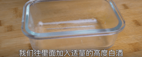 2、準備一個保鮮盒,加入少許的高度白酒。蓋上蓋子,把保鮮盒晃一晃。