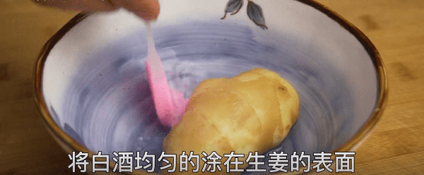 2、接著準備一瓶白酒,準備一個小碗,倒入白酒。在準備刷子蘸取白酒,均勻的塗抹在生薑的表面特別是接口處。