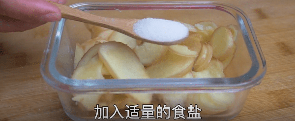 3、然後倒掉盒子裡白酒,再把生薑片放起來,加入適量的食鹽。