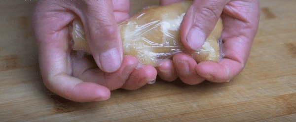 4、生薑表面沒有水分瞭,接著拿出保鮮膜,把生薑包裹起來。一邊包裹一邊把裡面的空氣擠出來。