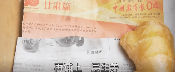 3、如果買的生薑多,可以再墊上一層報紙,再灑上一層小蘇打,再鋪上生薑,如此反復,直到我們箱子填滿,就可以鋪上報紙。